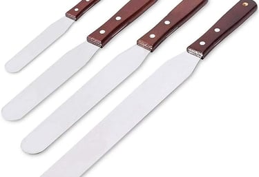 We recommend this Chef Inox wooden handled stainless-steel offset, it's the perfect size for typical celebration cakes and cupcakes, especially when used in conjunction with a larger straight spatula. This is the style that you'll see professional bakers, pastry chefs, and chefs have in their knife kit. A staple!