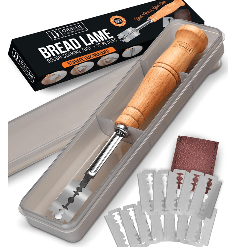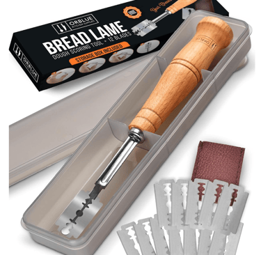 A bread lame (pronounced "lahm") is a tool used to score your dough just before baking to control how your bread expands in the oven, giving you those iconic patterns and "ears". The one we've recommended comes in a handy box which is super important, as these blades are very sharp and shouldn't be left in the open!